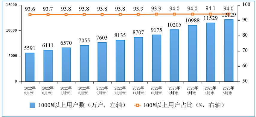固定宽带接入用户数稳步增加,千兆用户占比近两成。截至 5 月末,三家基础电信企业的固定互联网宽带接入用户总数达 6.11 亿户,比上年末净增 2143 万户。其中,100Mbps 及以上接入速率的固定互联网宽带接入用户达 5.74 亿户,占总用户数的 94%;1000Mbps 及以上接入速率的固定互联网宽带接入用户达 1.21 亿户,占总用户数的 19.8%,比上年末净增 2955 万户。