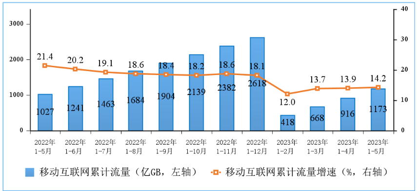 移动互联网流量增速持续提升,5 月 DOU 值创新高。1—5 月份,移动互联网累计流量达 1173 亿 GB,同比增长 14.2%,增速较 1—4 月份提升 0.3 个百分点。截至 5 月末,移动互联网用户数达 14.89 亿户,比上年末净增 3473 万户。5 月当月户均移动互联网接入流量(DOU)达到 17.26GB / 户・月,同比增长 10.8%,较上年 12 月份高 1.08GB / 户・月。