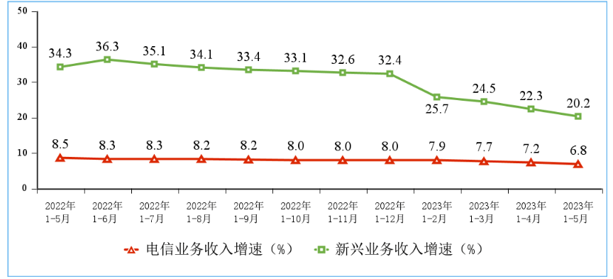 新兴业务收入保持较快增长。三家基础电信企业积极发展 IPTV、互联网数据中心、大数据、云计算、物联网等新兴业务,1—5 月份共完成业务收入 1519 亿元,同比增长 20.2%,在电信业务收入中占比为 21.3%,拉动电信业务收入增长 3.8 个百分点。其中云计算和大数据收入同比分别增长 46.6% 和 47.3%,物联网业务收入同比增长 25.1%。