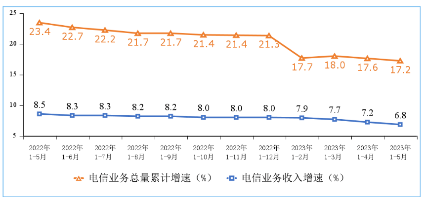 电信业务收入稳步增长,电信业务总量保持两位数增幅。1—5 月份,电信业务收入累计完成 7125 亿元,同比增长 6.8%,按照上年不变价计算的电信业务总量同比增长 17.2%。