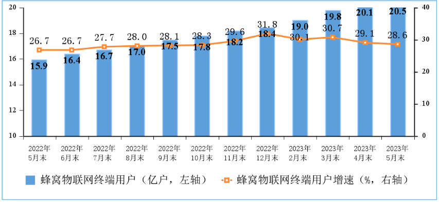蜂窝物联网用户规模快速扩大,IPTV 用户稳步增加。截至 5 月末,三家基础电信企业发展蜂窝物联网终端用户 20.51 亿户,比上年末净增 2.06 亿户,占移动网终端连接数(包括移动电话用户和蜂窝物联网终端用户)的比重达 54.6%。IPTV(网络电视)总用户数达 3.9 亿户,比上年末净增 996 万户。