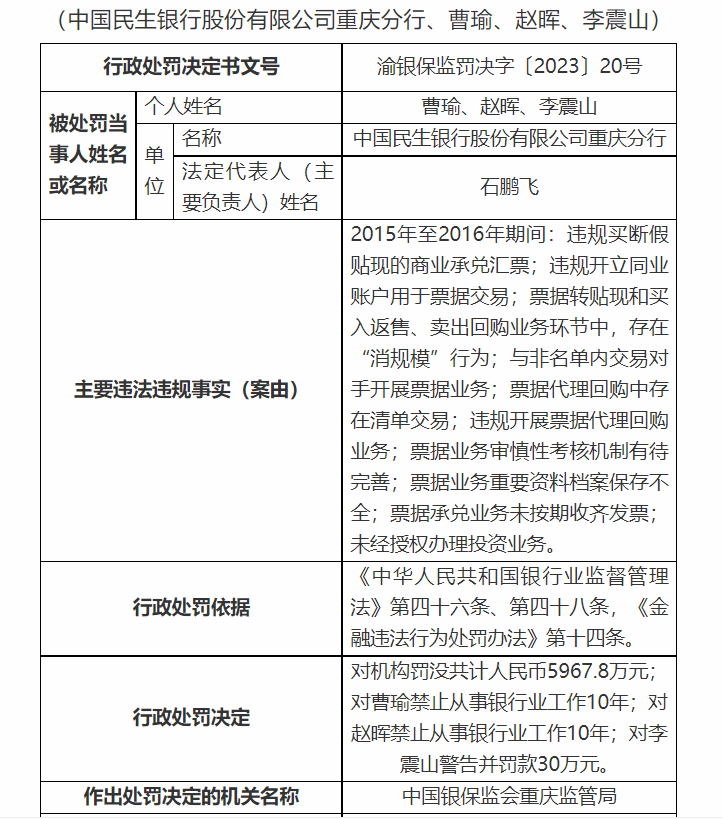 民生银行重庆分行被重庆银保监局罚款5967.8万,曹某和赵某被禁止从事银行业10年。该行存在如下问题: