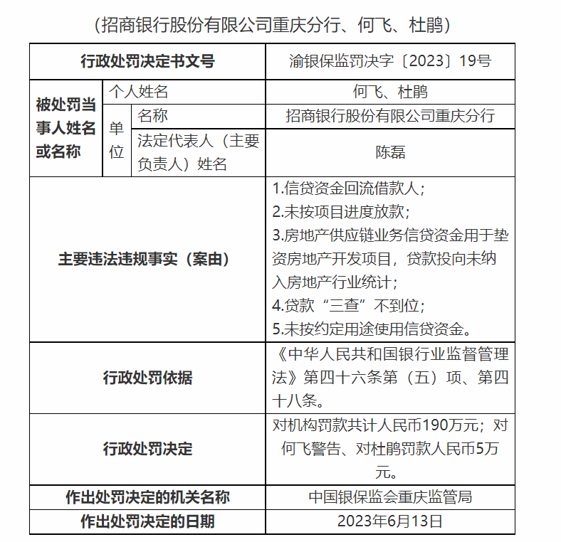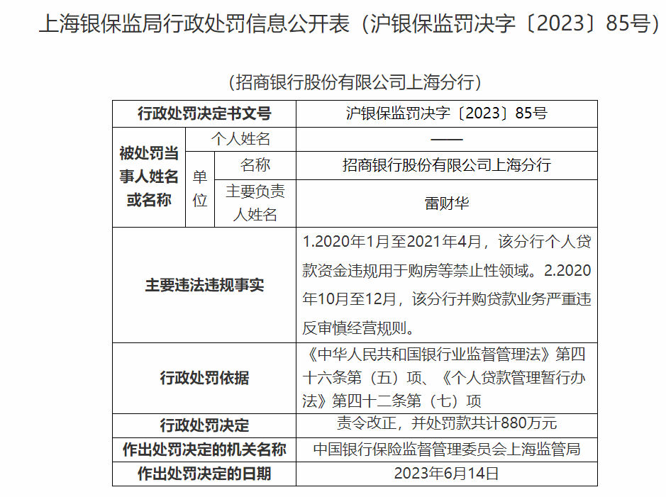 招商银行重庆分行被重庆银保监局罚款190万元,招商银行上海分行领了两张罚单,一张880万元,一张160万元。招商银行合计被罚款1230万元。