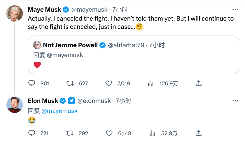 不过,马斯克的母亲梅耶·马斯克(Maye Musk)则在推特上否定了两位超级富豪的“掐架”。