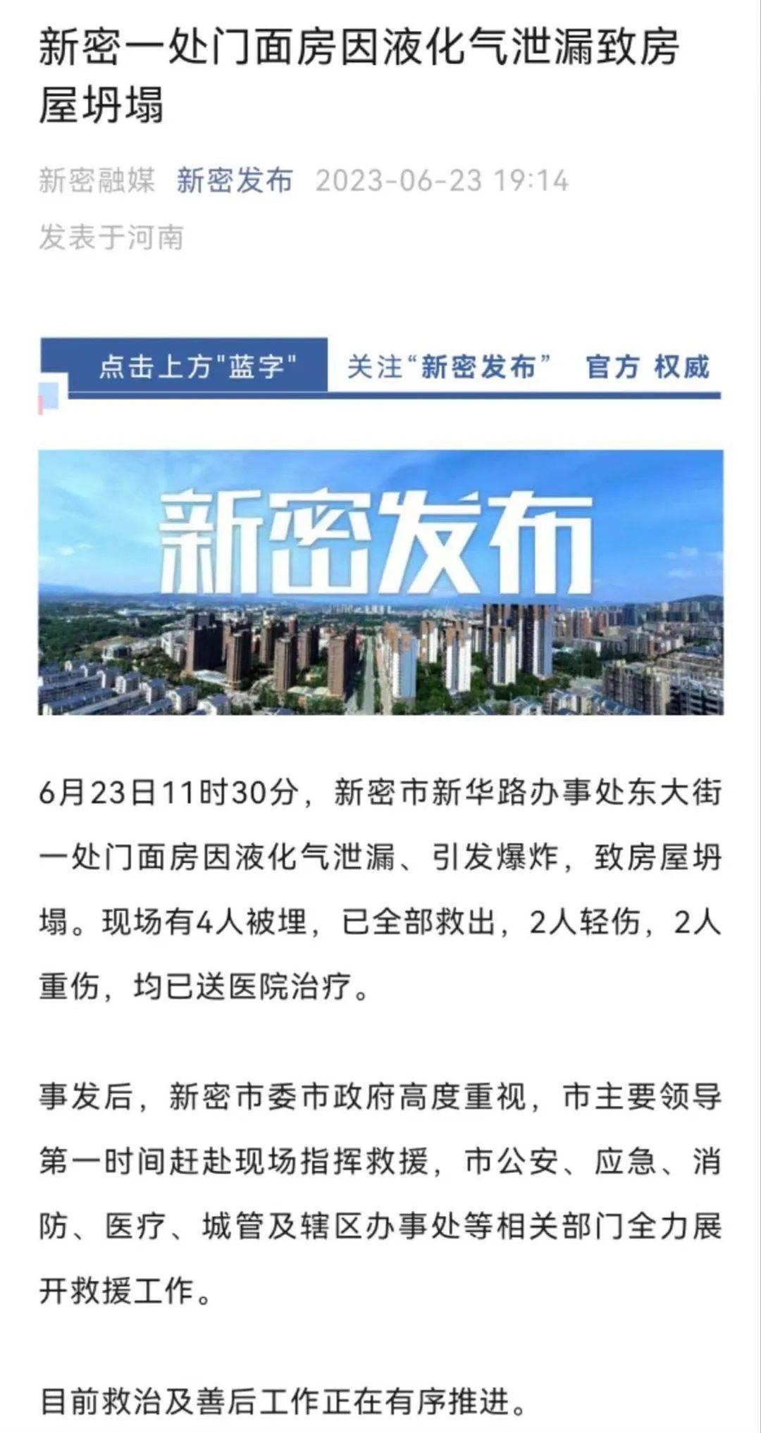 23日晚7时14分,“新密发布”官方微信发布通报称,6月23日11时30分,新密市新华路办事处东大街一处门面房因液化气泄漏、引发爆炸,致房屋坍塌。现场有4人被埋,已全部救出,2人轻伤,2人重伤,均已送医院治疗。