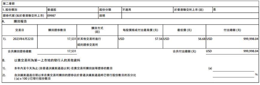 百胜中国6月23日在港交所公告,6月22日,公司于纽约证券交易所按每股56.68美元-57.56美元,耗资约100万美元回购1.75万股公司股份。