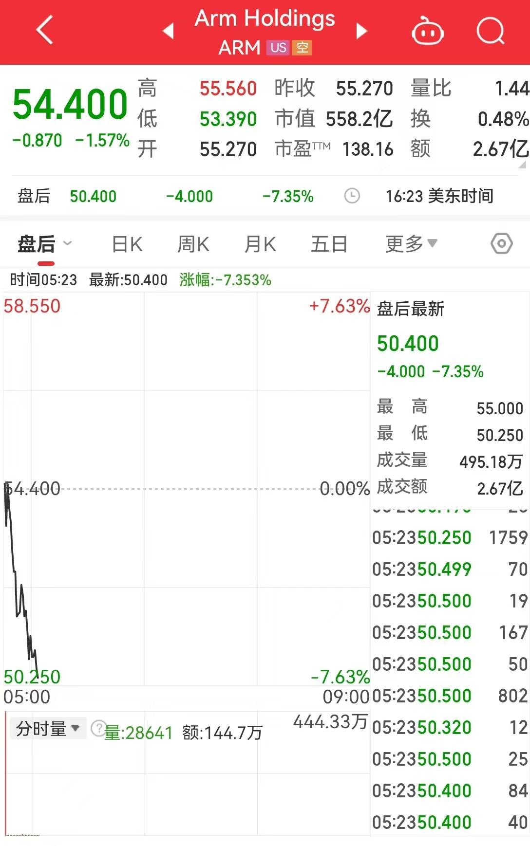 截至收盘,Arm报54.4美元,跌幅1.57%,市值558.2亿美元。财报公布后,Arm美股盘后跌超7%