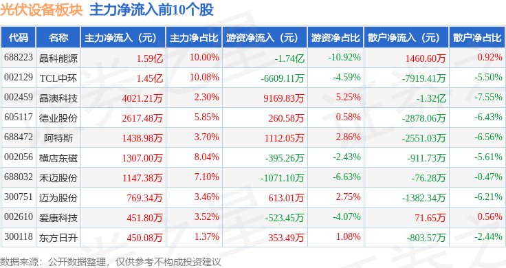 从资金流向上来看,当日光伏设备板块主力资金净流出9183.79万元,游资资金净流出3838.65万元,散户资金净流入1.3亿元。光伏设备板块个股资金流向见下表: