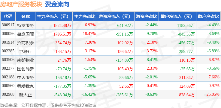 从资金流向上来看,当日房地产服务板块主力资金净流入3177.33万元,游资资金净流出1652.53万元,散户资金净流出1524.81万元。房地产服务板块个股资金流向见下表: