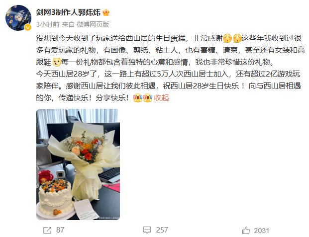 郭炜炜:短期内的目标是的。现在西山居的各个重要岗位都涌现出了很多优秀的年轻人,我相信他们在未来,一定能实现比肩《剑网3》的任务。