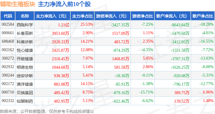 从资金流向上来看,当日辅助生殖板块主力资金净流出5527.7万元,游资资金净流入1.01亿元,散户资金净流出4564.58万元。辅助生殖板块个股资金流向见下表: