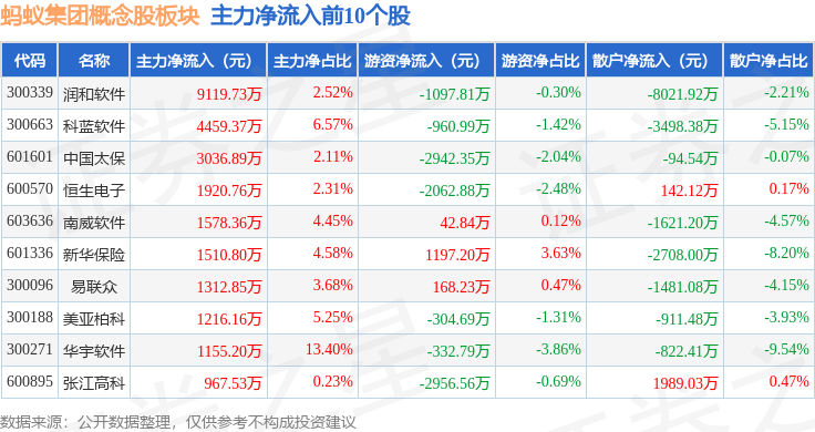 从资金流向上来看,当日蚂蚁集团概念股板块主力资金净流出2.8亿元,游资资金净流出2702.66万元,散户资金净流入3.07亿元。蚂蚁集团概念股板块个股资金流向见下表: