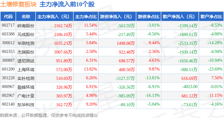 从资金流向上来看,当日土壤修复板块主力资金净流出3.41亿元,游资资金净流入2.0亿元,散户资金净流入1.41亿元。土壤修复板块个股资金流向见下表: