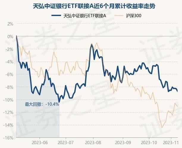 证券之星消息,11月8日,天弘中证银行ETF联接A最新单位净值为1.1923元,累计净值为1.1923元,较前一交易日下跌0.41%。历史数据显示该基金近1个月下跌3.89%,近3个月下跌5.41%,近6个月下跌8.68%,近1年上涨10.88%。该基金近6个月的累计收益率走势如下图: