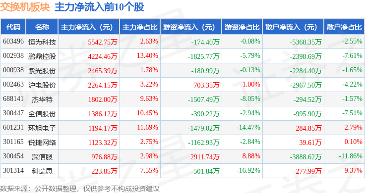 从资金流向上来看,当日交换机板块主力资金净流出3.77亿元,游资资金净流入542.69万元,散户资金净流入3.72亿元。交换机板块个股资金流向见下表: