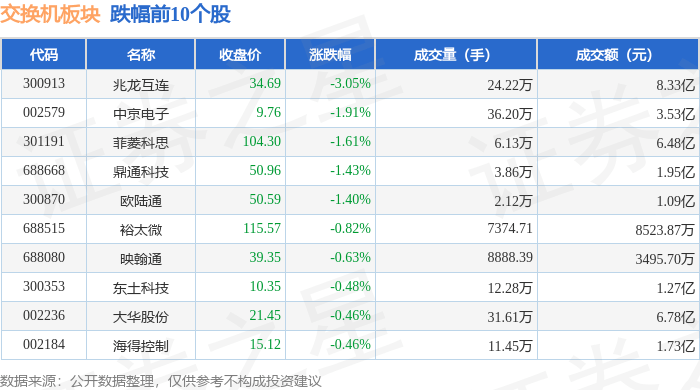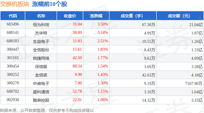 北向资金方面,当日交换机板块北向资金持股市值为139.78亿元,减持0.83亿元。其中增持最多的是剑桥科技,增持了0.24亿元。减持持最多的是紫光股份,减持了0.87亿元。交换机板块北向资金持股变动明细见下表: