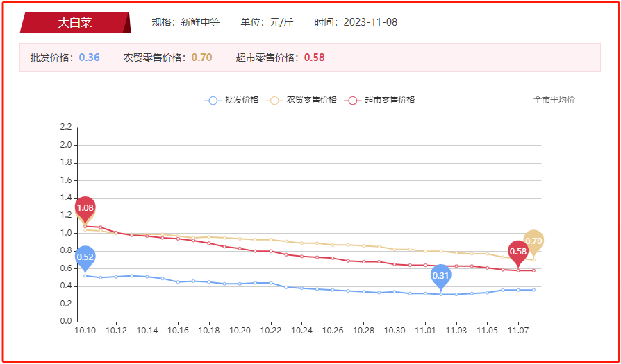 市发改委官网显示,大白菜价格10月以来一路走低。
