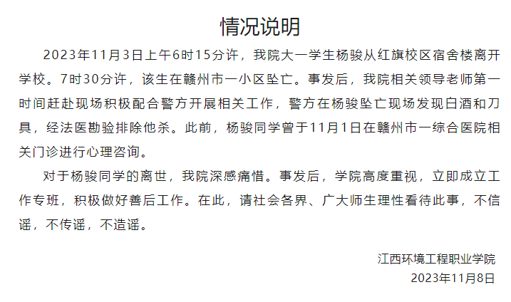 新京报讯 据江西环境工程职业学院官微消息,2023年11月3日上午6时15分许,我院大一学生杨骏从红旗校区宿舍楼离开学校。7时30分许,该生在赣州市一小区坠亡。事发后,我院相关领导老师第一时间赶赴现场积极配合警方开展相关工作,警方在杨骏坠亡现场发现白酒和刀具,经法医勘验排除他杀。此前,杨骏同学曾于11月1日在赣州市一综合医院相关门诊进行心理咨询。