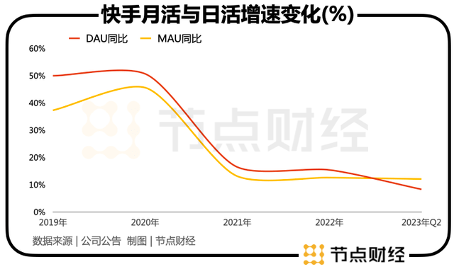 快手过去几年的用户数据变化也验证了这一趋势。据节点财经统计,2021年以来,快手的月活与日活的同比增速持续跌破了20%,今年上半年,两项数据的增速分别为12.09%与8.29%。