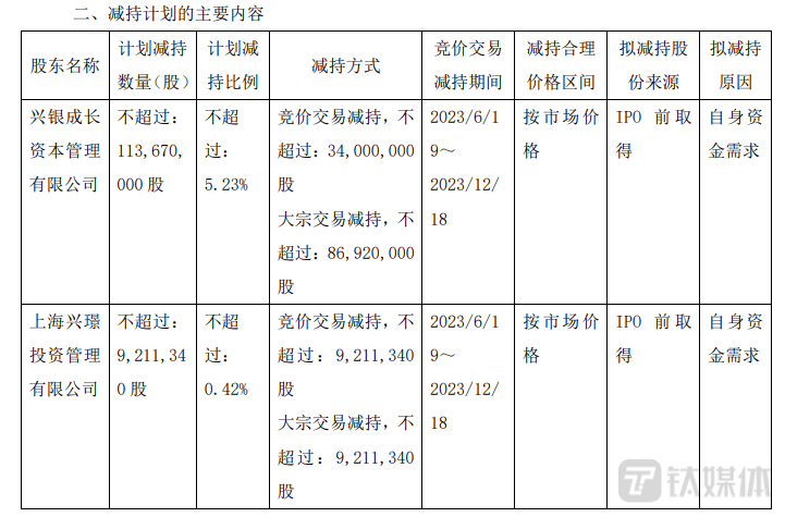 资料显示,兴璟投资为兴银资本全资子公司,二者均为5%以上股东。因自身发展和资金需求,兴银资本拟减持合计不超过总股本5.23%的股票,即1.14亿股;兴璟投资则是“清仓式”减持,拟减持合计不超过总股本0.42%的股票,即921.13万股。二者将于6月19日至12月18日期间合计减持不超过1.23亿股,占总股本比例为5.65%。若按5月29日收盘价估算,此次减持可套现约49.57亿元。