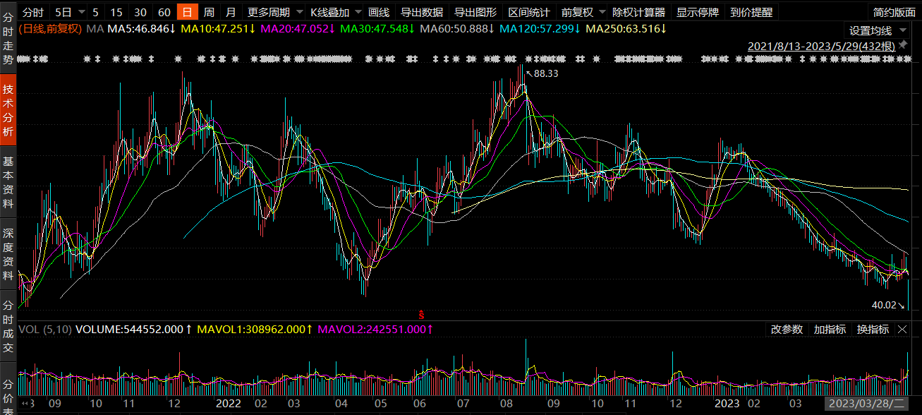 从K线图走势来看,2月份以来的股价明显进入到下行通道。不到半年的时间,股价已较去年8月16日88.33元的历史高点回撤54%,同时创下2021年9月以来的最低点。
