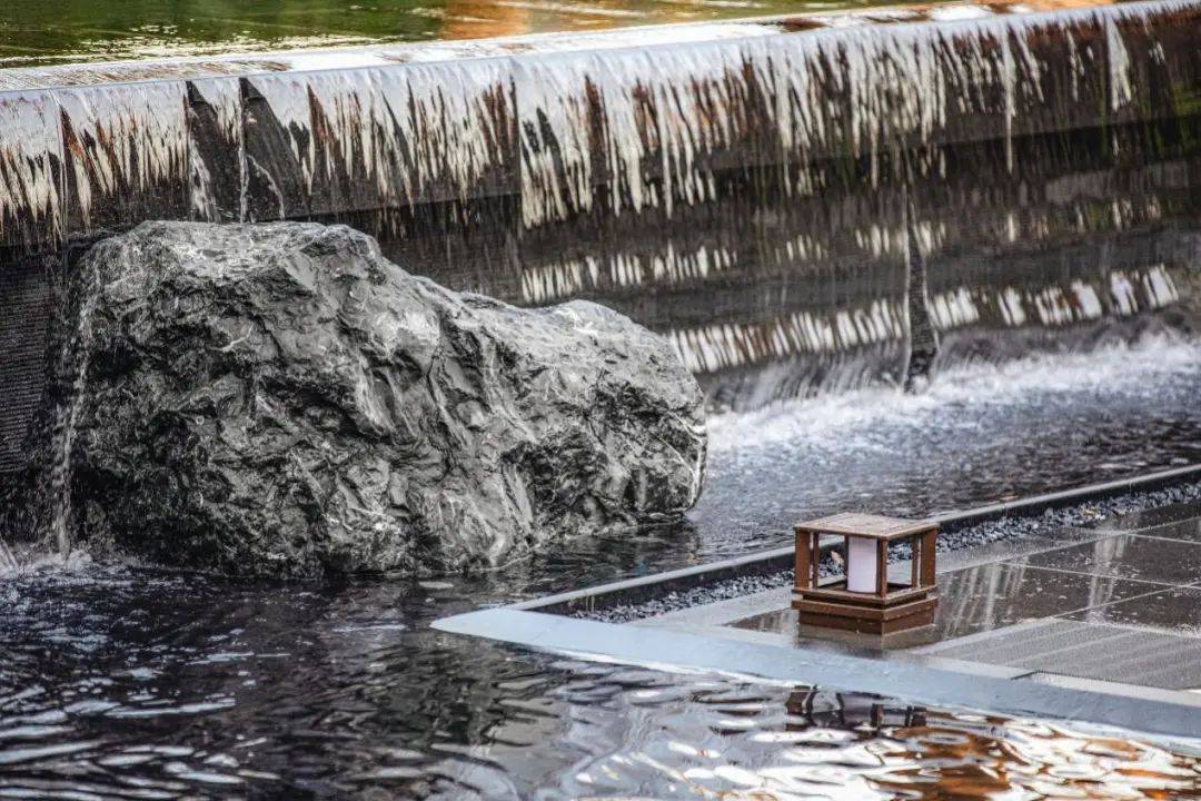 又比如,项目延续了张园“引水入园”的理念,将长200米、近1000m²的水系覆盖到整个社区内。水景形态各异,有中心静水、三层跌水、点状涌泉、立面叠瀑、弧形流水五大不同呈现方式。水系的引入,让整个社区彻底灵动飘逸了起来。