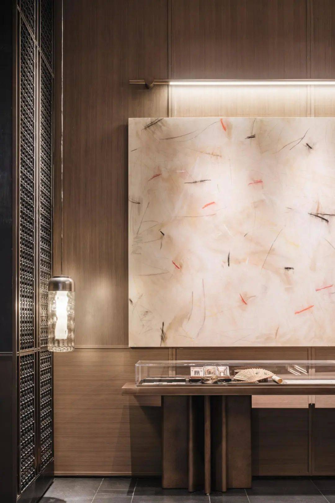例如,在归家的动线上,保利以古代“提灯夜游”为灵感,将“灯”这一意向穿插其中——在公区入户大堂内,造型别致的壁灯,其灵感来自于“中国古典豆形灯”;落壁灯则是以古铜不锈钢搭配仿透光云石灯具,营造出朦胧的光晕氛围,颇具东方意蕴。