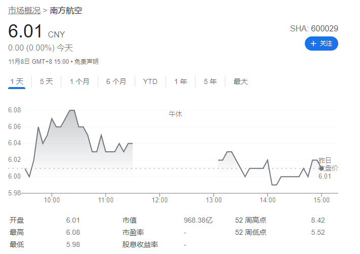 南方航空发布的 2022 年财报显示,该公司在 2022 年亏了 326.82 亿元,创下南航史上最大亏损。2022 年,南航实现营业收入 870.59 亿元,同比减少 14.35%。截至IT之家发稿,南航股价为 6.01 元每股,市值 968.38 亿元。