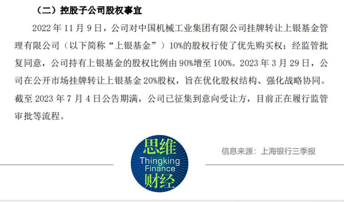 高层变动未息,上银基金股东又蠢蠢欲动。2021年12月,国机集团准备将上银基金10%的股权挂牌转让,但之后由于各种存在影响产权交易的事项,多次被终止。直到2022年11月,上海银行对国机集团挂牌转让上银基金10%的股权行使了优先购买权。
