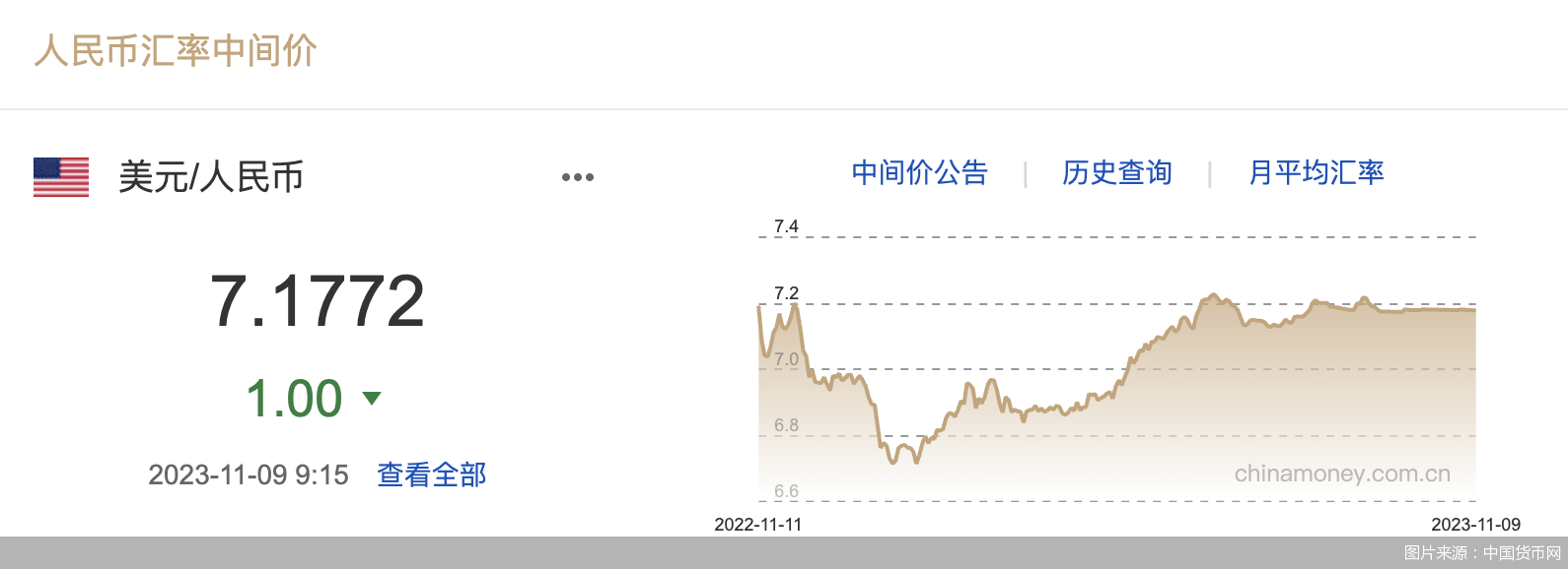 北京商报讯(记者 廖蒙)11月9日,人民银行授权中国外汇交易中心公布,2023年11月9日银行间外汇市场人民币汇率中间价为:1美元对人民币7.1772元,前一交易日中间价报7.1773元,单日调升1基点。人民币中间价连续第六个交易日小幅回升。