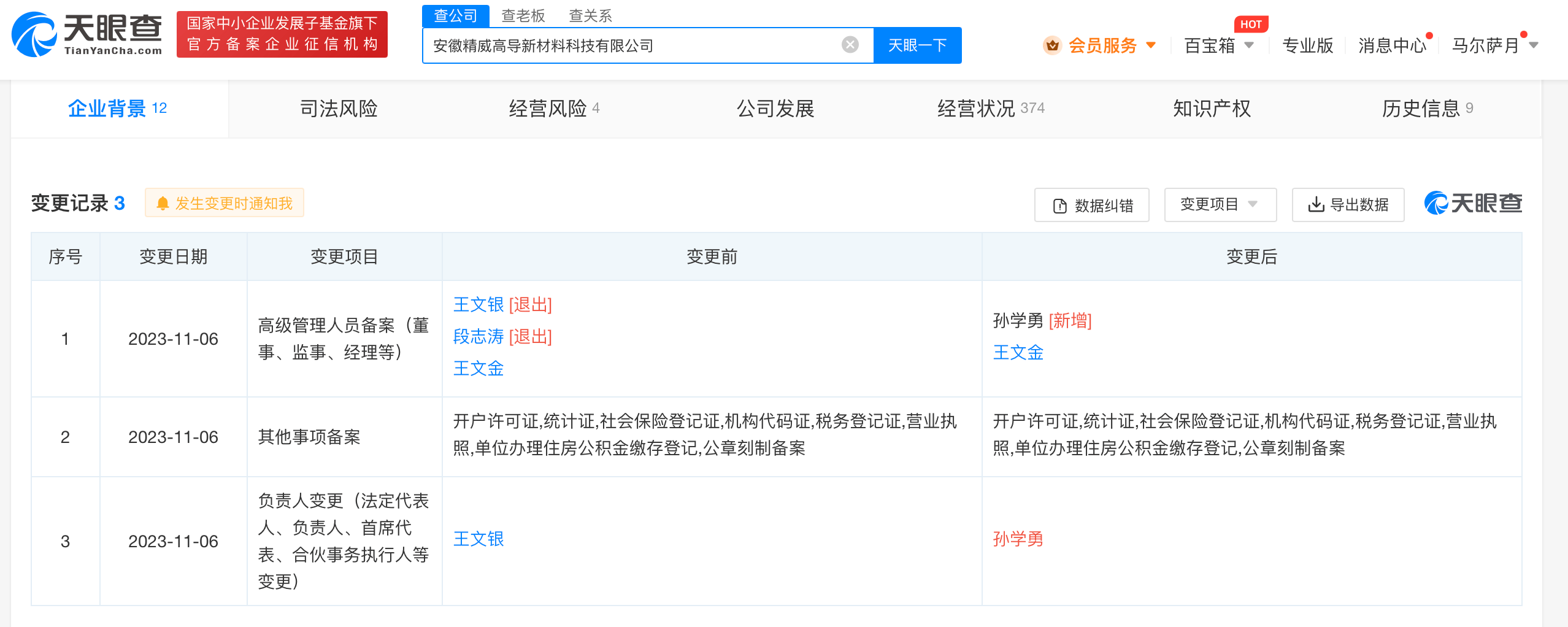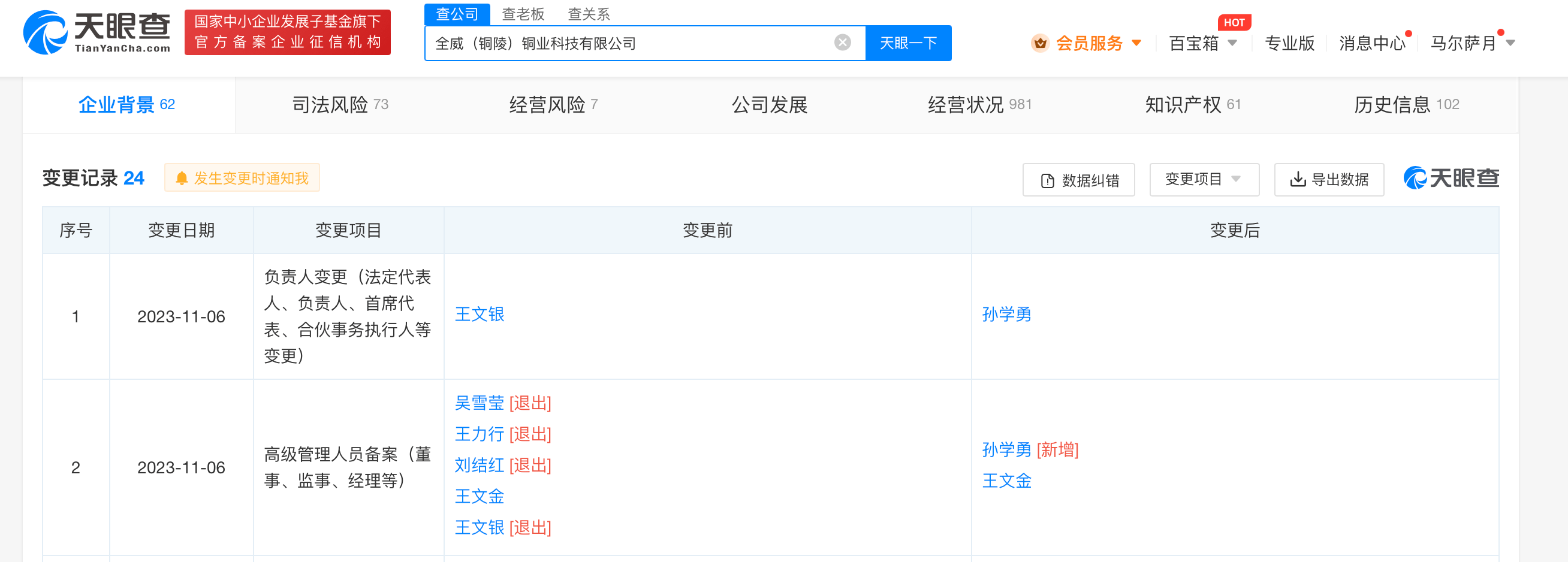 天眼查App显示,近日,正威旗下全威(铜陵)铜业科技有限公司、安徽精威高导新材料科技有限公司发生工商变更,王文银卸任法定代表人、董事长或执行董事,均由孙学勇接任法定代表人、执行董事。值得一提的是,不久前,王文银已卸任深圳正威(集团)有限公司、深圳正威金融控股有限公司法定代表人、董事长。