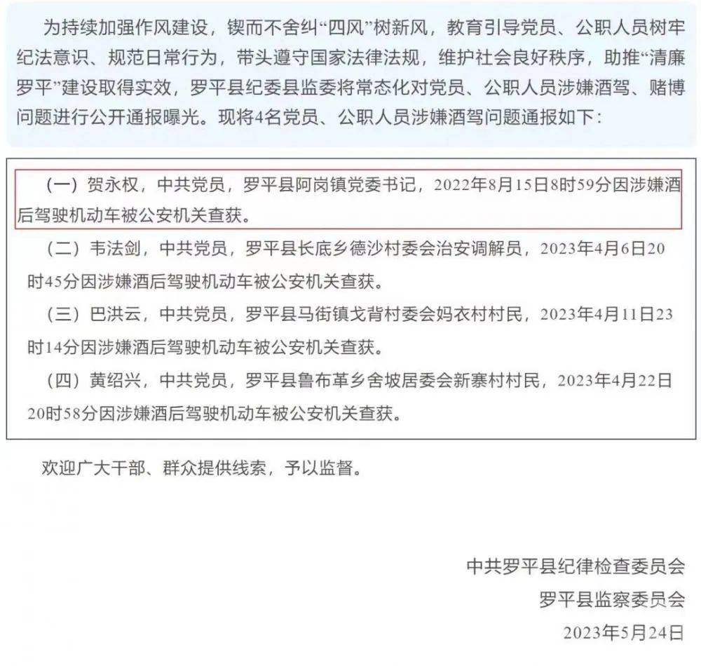 5月24日,云南省曲靖市罗平县纪委监委公布的一份党员、公职人员涉嫌酒驾问题的公开通报引起广泛关注。有人质疑时任罗平县阿岗镇党委副书记、镇长贺永权在2022年8月15日因涉嫌酒后驾驶机动车被公安机关查获后,在同年11月30日又参与了任职公示,随后升任镇党委书记。有人质疑涉嫌酒驾官员“无损升职”破坏了纪委监委执纪监督的权威性。