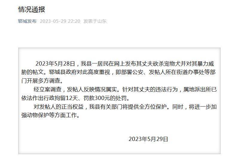 原标题:山东郓城通报“男子砍杀宠物犬并暴力威胁妻子”:行拘12天