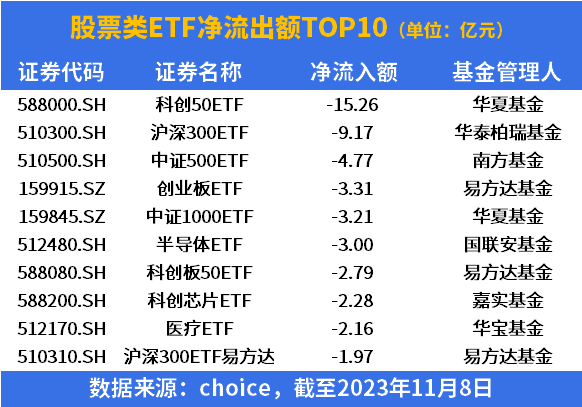 资金净流出中,华夏基金科创50ETF(588000)、华泰柏瑞基金沪深300ETF(510300)、南方基金中证500ETF(510500)位居前三,最高净流出15.26亿元。