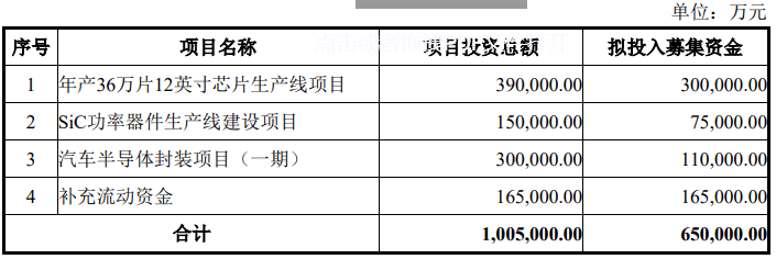 《电鳗财经》查阅信息发现,士兰微本次募资规模高达65亿元,主要投向12英寸芯片产线、SiC功率器件产线、汽车半导体封装等项目,总投资额100.5亿元,拟使用募资占比64.68%。