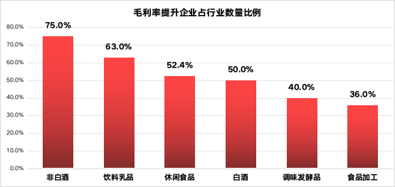 金融界上市公司研究院统计发现,在食品饮料领域的6个行业中,饮料乳品、休闲食品等4个行业,有半数及以上企业的毛利率水平提升,而调味发酵品和食品加工2个行业,有不足半数企业的毛利率水平提升。