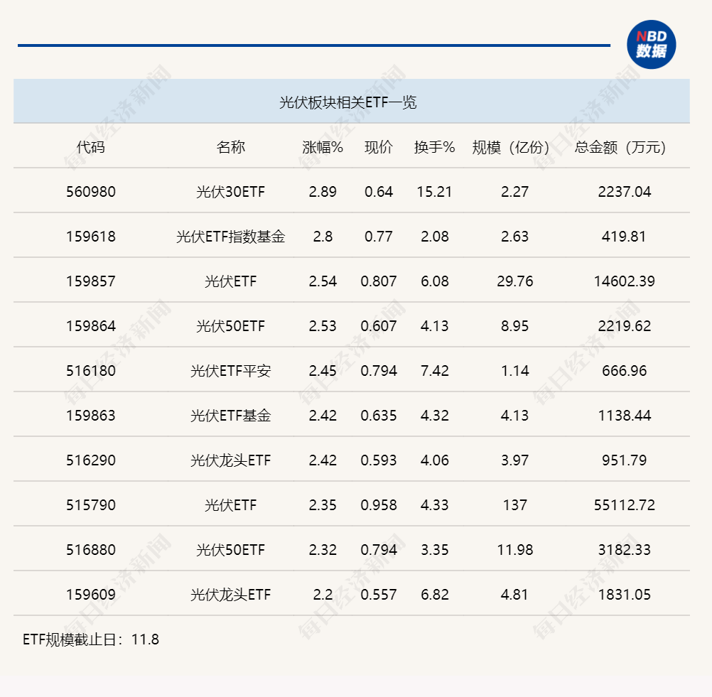 点评:目前光伏ETF中规模最大的ETF为光伏ETF(515790),其ETF规模达到137亿份,这也是该行业规模唯一过百亿份的ETF,今日上午成交达到5.11亿元,交易较为活跃,该ETF追踪的指数为中证光伏产业指数。