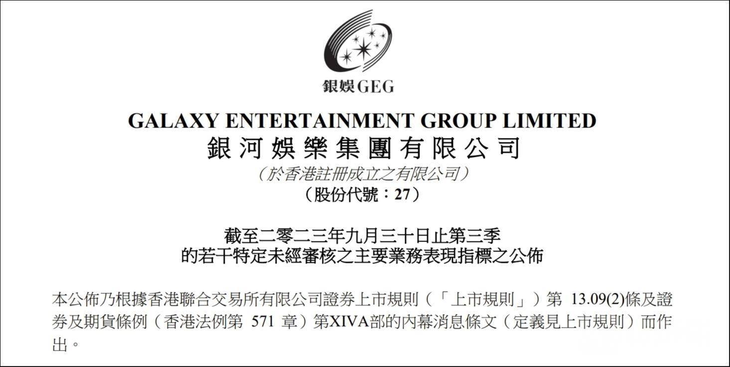 11月9日晨间,银河娱乐(00027.HK)发布了2023年第三季度业绩报告。