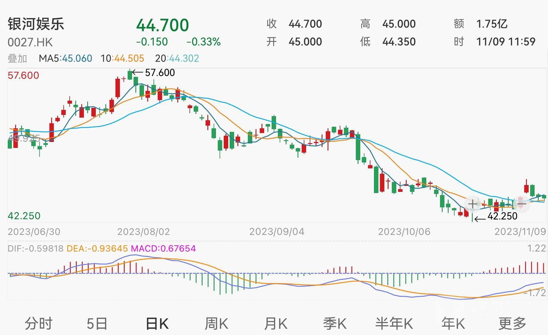 虽然公司在最新披露的三季度业绩报告中表现不俗,但二级市场方面的反应却不算理想。截至11月9日早盘休市,股价报44.7港元,微跌0.33%,成交额为1.75亿港元,当前公司总市值约1954.99亿港元。