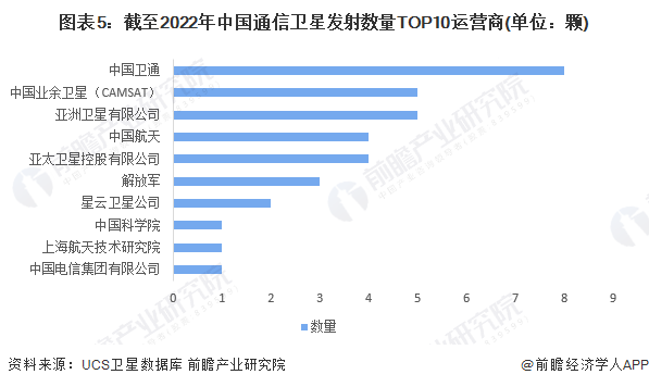 根据UCS卫星数据库,截至2022年5月,中国卫星发射数量TOP10运营商主要以国有背景为主,如中国卫通、中国航天、上海航天、亚洲卫星、亚太卫星等。中国卫通发射数量最多,达到8颗;中国业余卫星、亚洲卫星有限公司发射数量均达到5颗。