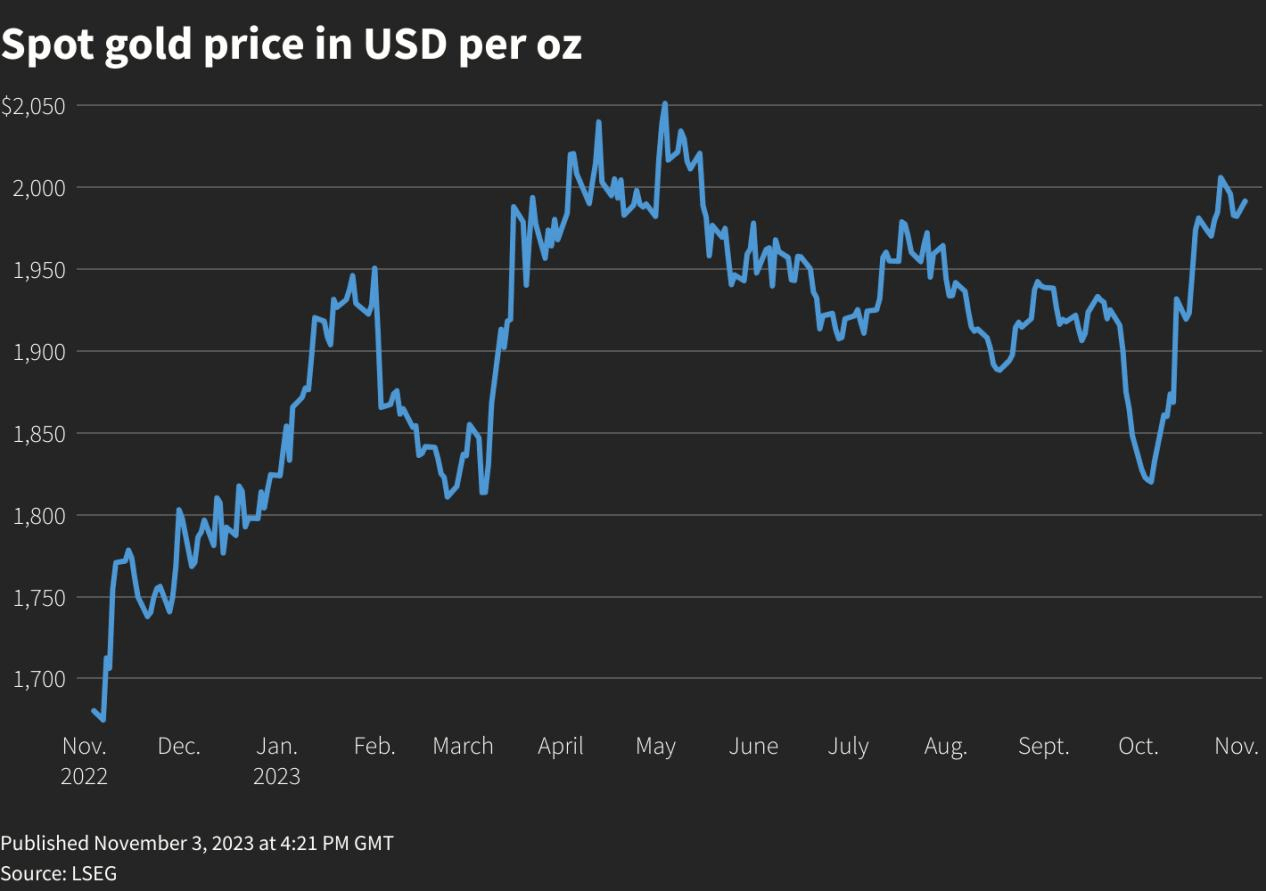 以色列-哈马斯战争爆发后,地缘政治战争溢价在推动金价的上涨。金价从每盎司1840美元的水平飙升,在10月27日直接站上了2009美元上方,为5月中旬以来的最高位,单月也创下了数十年来的最佳10月份表现。除了巴以局势外,投资者基本确认美联储已经结束了本轮加息周期,也是金价向上爆发的助攻。