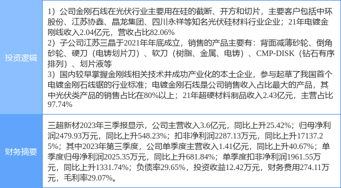 证券之星消息,三超新材涨停收盘,收盘价29.45元。该股于9点30分涨停,未打开涨停,截止收盘封单资金为3100.72万元,占其流通市值1.38%。