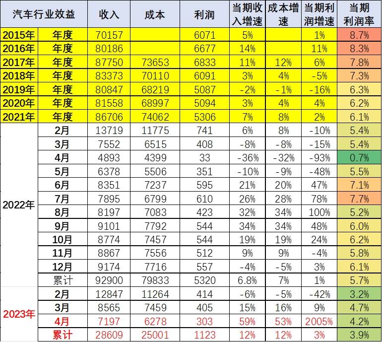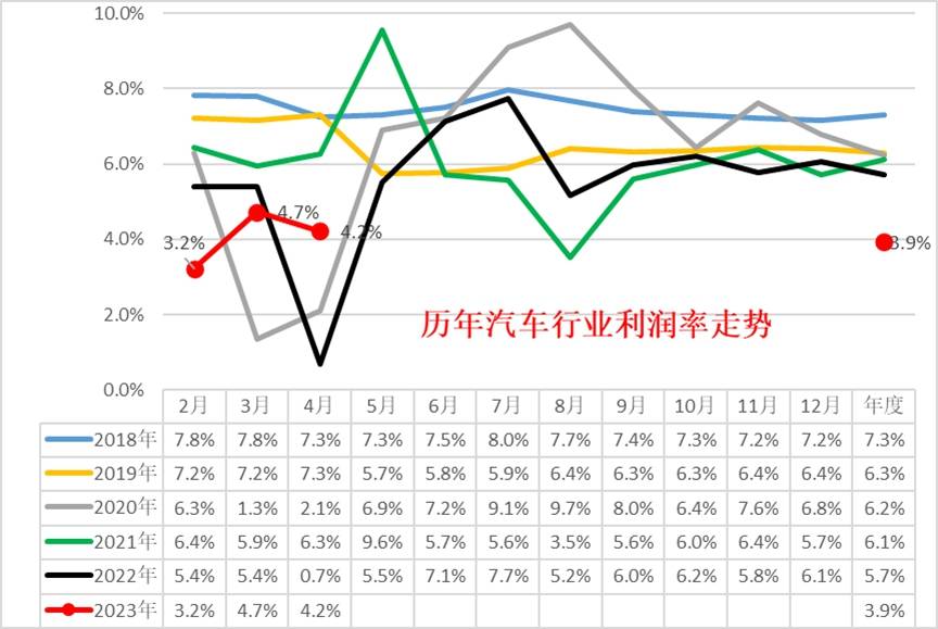从上面的表格可以看出,2022年汽车行业利润总体表现不强,销售利润率仅有5.7%,较历史正常水平下降较大。2023年1-4月份,汽车行业销售利润率仅有3.9%。随着企业复工复产持续推进,市场需求逐步恢复,产销衔接水平提高,基数效应影响减弱,工业企业利润或将逐步回升。