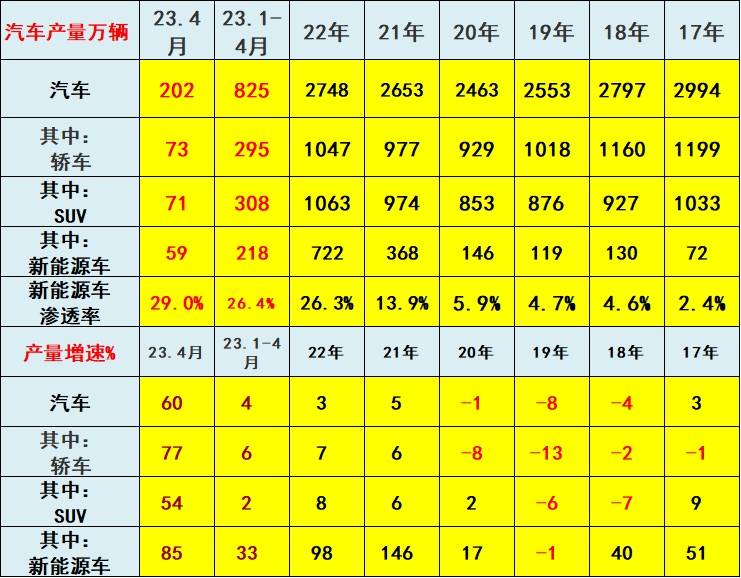 国家统计局公布的数据显示,2023年4月全国生产汽车202万辆,同比增长60%;生产新能源汽车59万辆,同比增长85%。4月份新能源车的渗透率达到29%,这是一个很高的增长。不过,新能源车的亏损仍然较大,而燃油车的盈利相对要好,但市场萎缩得较快。