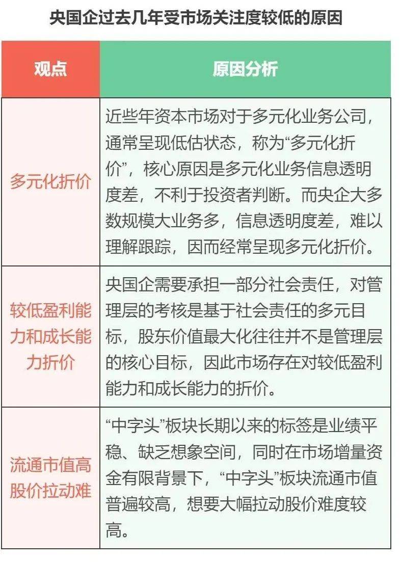 “首先,中国经济正向高质量发展转型,推进中国式现代化,兼顾发展与安全也在成为政策的重点,央国企改革持续推进,央国企所承担的时代使命和面临的时代机遇都是价值重估的重要背景;另一方面,过去一个阶段,可能对于一些稳定增长的公司估值折价明显,没有充分反映近年国企改革推进所取得的成效与后续进展,这也是央国企价值重估的一个基础。”