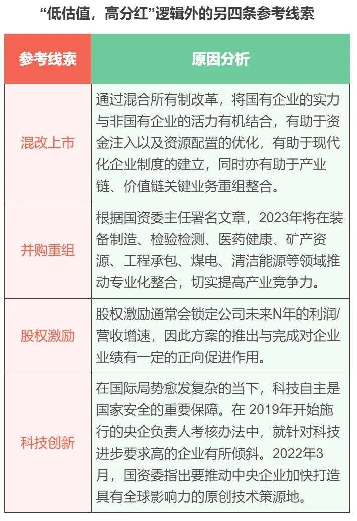 浙商证券首席策略分析师王杨接受记者采访表示,新一轮国企改革政策催化,除“低估值,高分红”投资逻辑外,还有以下四条线索可供参考:混改上市、并购重组、股权激励与科技创新。而在并购重组方面,根据国资委主任署名文章,2023年将在装备制造、检验检测、医药健康、矿产资源、工程承包、煤电、清洁能源等领域推动专业化整合。
