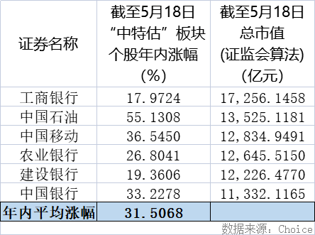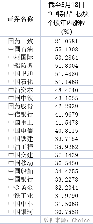 据记者观察,这轮“中特估”行情有着较为鲜明的“大而美”的特征。例如,板块内有代表性行业龙头,如中国石油、中国石化、中国中铁、中信银行、中国电信、中国铁建、中国交建、中国移动、中国船舶、中国银行、中国中车等,至5月18日,年内的涨幅都超过了30%。这无疑是今年来“资产荒”背景下令人羡慕的收益率。