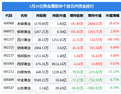 北向资金方面,当日贵金属板块北向资金持股市值为52.95亿元,增持0.24亿元。其中增持最多的是赤峰黄金,增持了0.29亿元。减持持最多的是山东黄金,减持了0.2亿元。贵金属板块北向资金持股变动明细见下表: