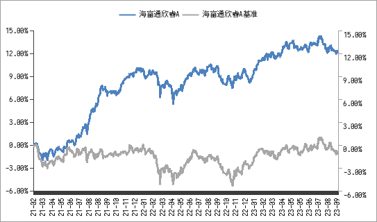 有一只偏债混合型产品表现很突出——海富通欣睿混合(A类:010657 C类:010658)成立于2021年2月9日,产品自成立以来定期报告披露的权益仓位基本稳定于30%以内。海富通欣睿混合A成立至今年9月末,共计630个交易日,单位净值创新高次数高达89次,处于全市场偏债混合基金同期前3%分位水平。