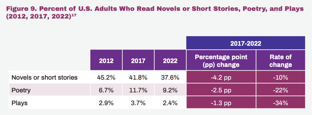 在过去一年中,美国成年人阅读过小说或短篇故事、诗歌和剧本的比例(2012年、2017年、2022年三次调查结果对比)。图片来源自美国国家艺术基金会的调查报告(SPPA)。
